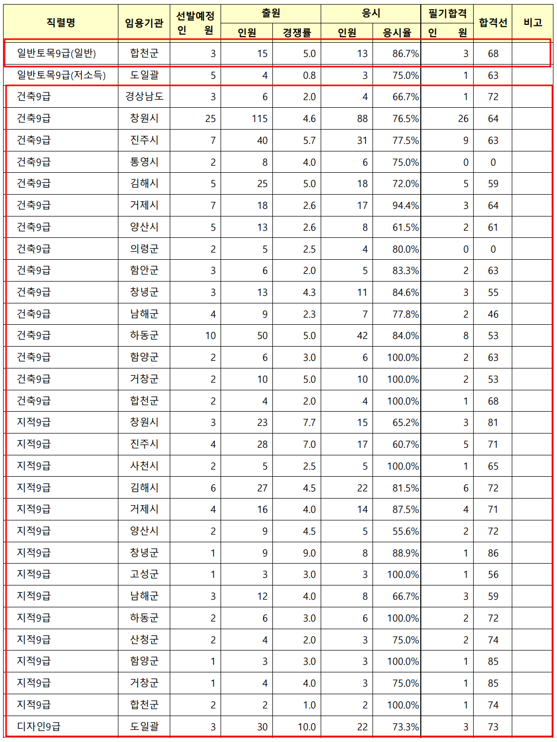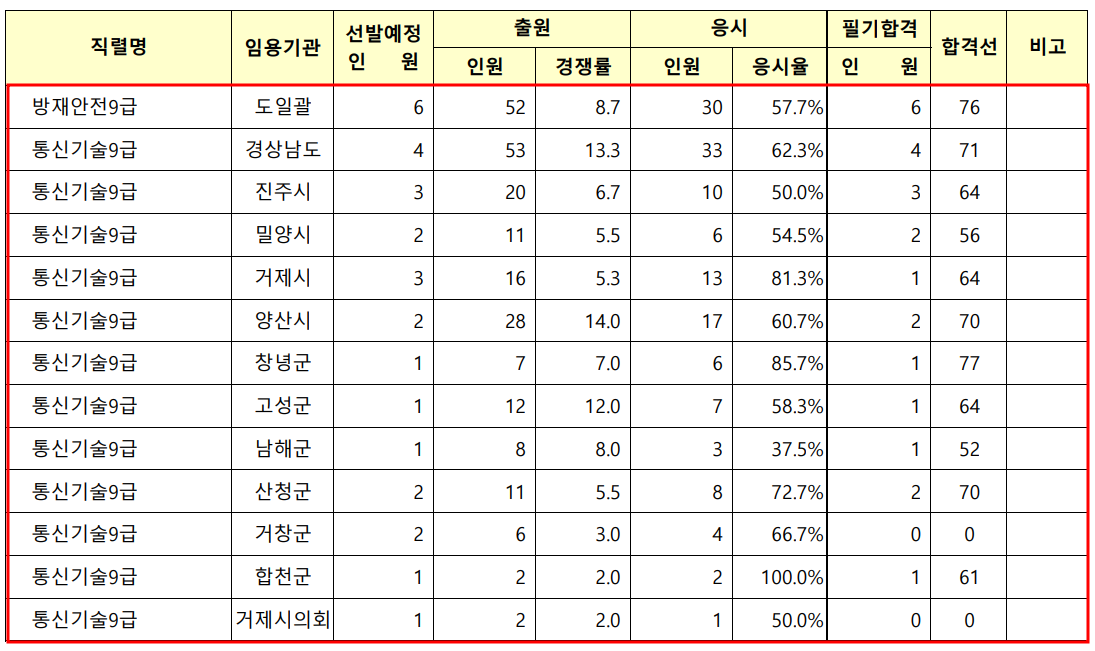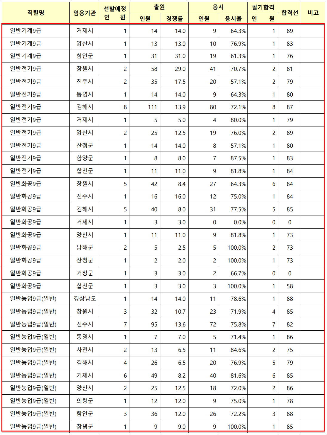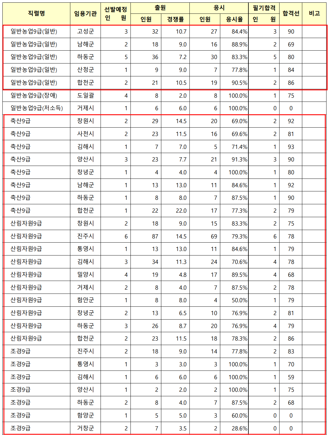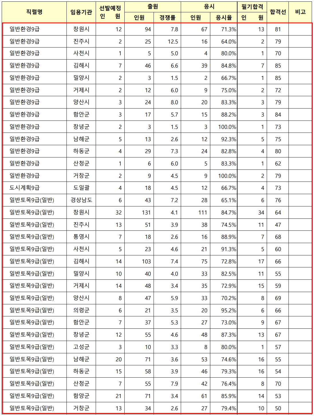 이번 포스팅에서는 먼저 경남 지방직 공무원 9급 공채 주요 일반 모집 직렬의 선발인원, 경쟁률, 필기시험 합격선, 합격률 등을 비교한 후, 장애인 및 저소득 구분 모집의 모집을 포함한 전 모집 직렬의 경쟁률과 합격선을 정리했습니다.