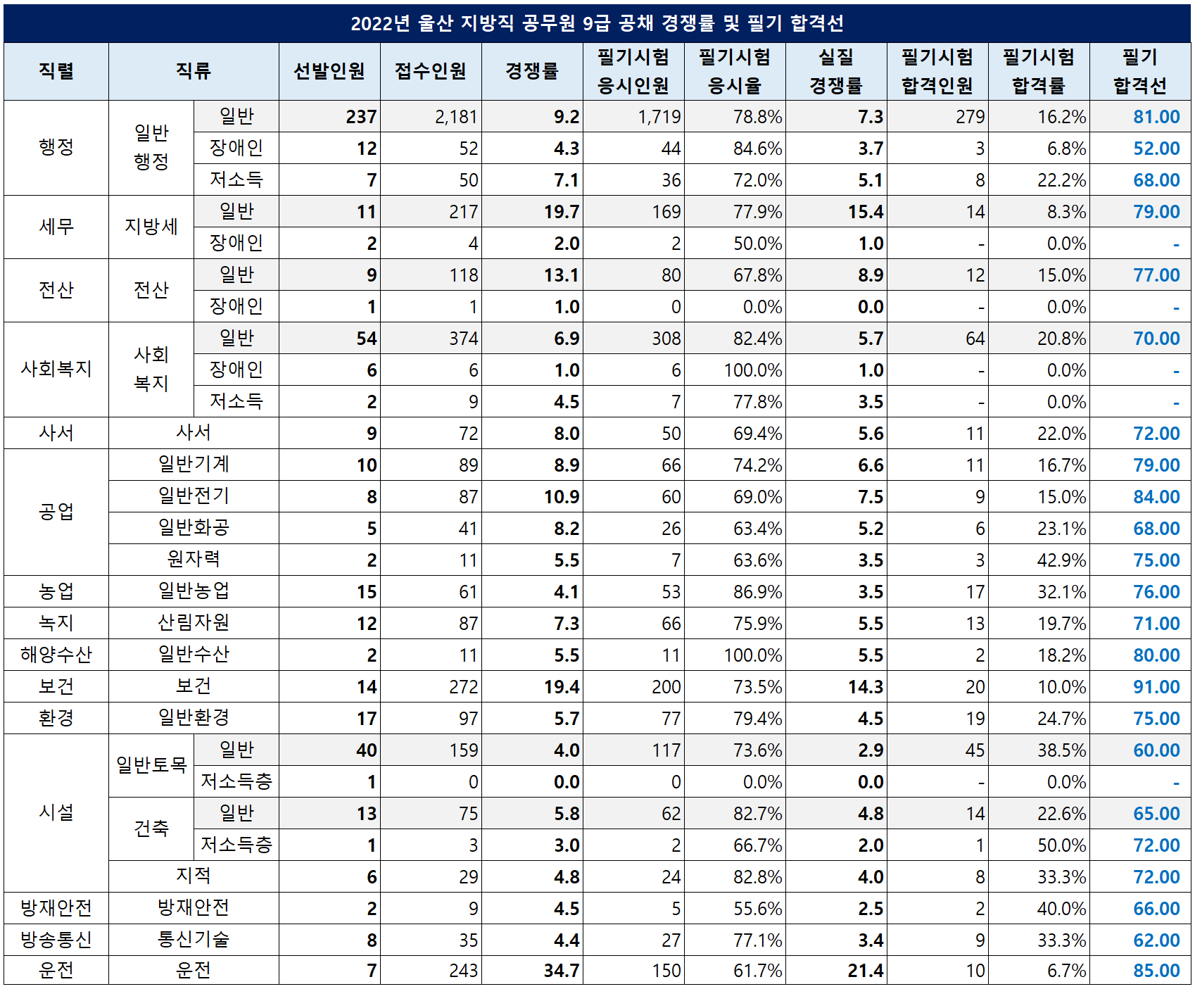이번 포스팅에서는 2022년 울산 지방직 공무원 9급 공채로 선발하는 직렬의 선발예정인원, 원서접수인원, 경쟁률, 필기시험 응시인원, 응시율, 합격선, 합격률 등을 정리했습니다.