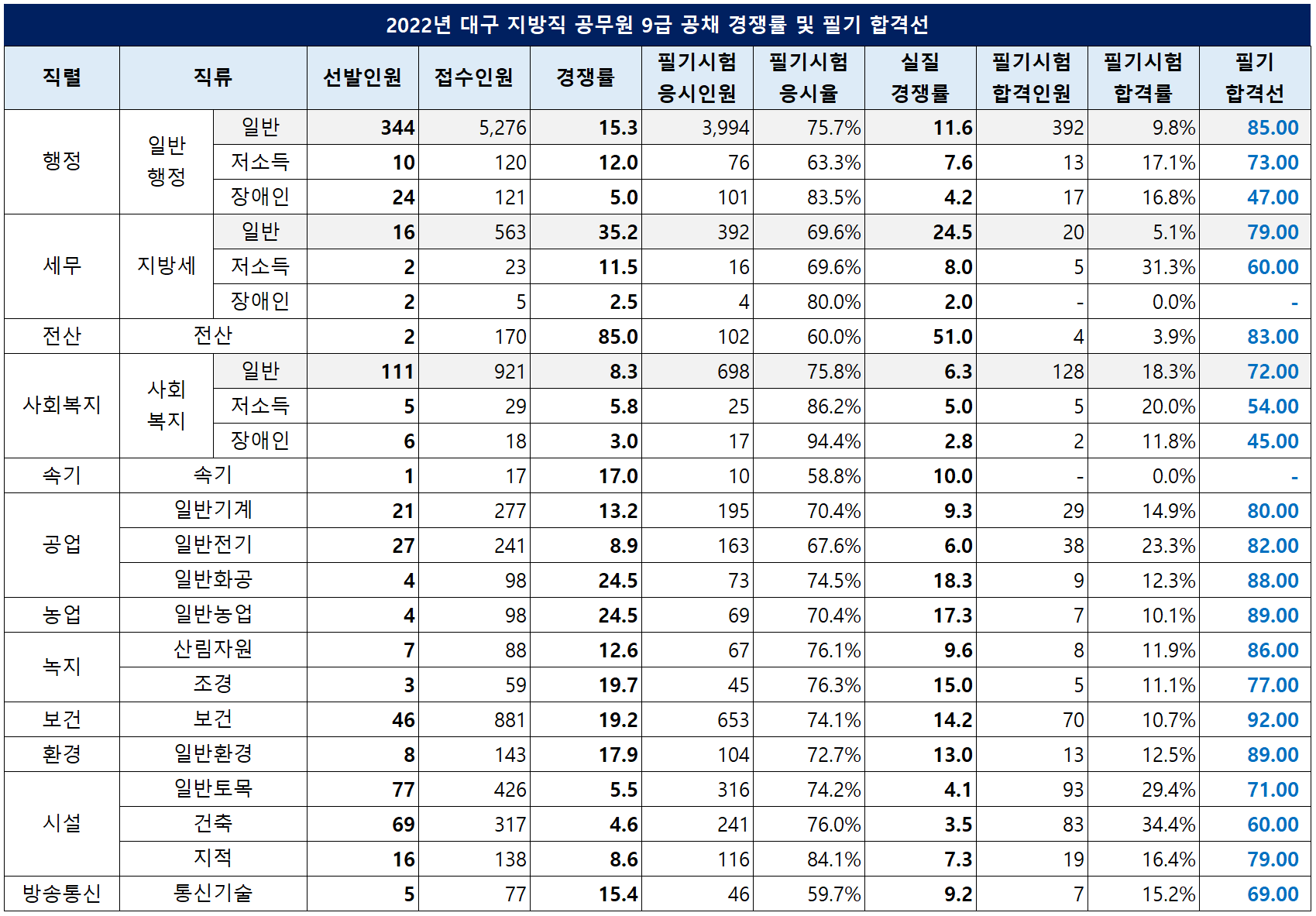 2022년 대구 지방직 공무원 9급 공채 모집 직렬 중에서 전산직의 경쟁률이 가장 높았는데요. 2명을 선발하는데 170명이 지원해 85.0대 1의 경쟁률을 기록했고, 필기 합격선은 83.00점이었습니다.