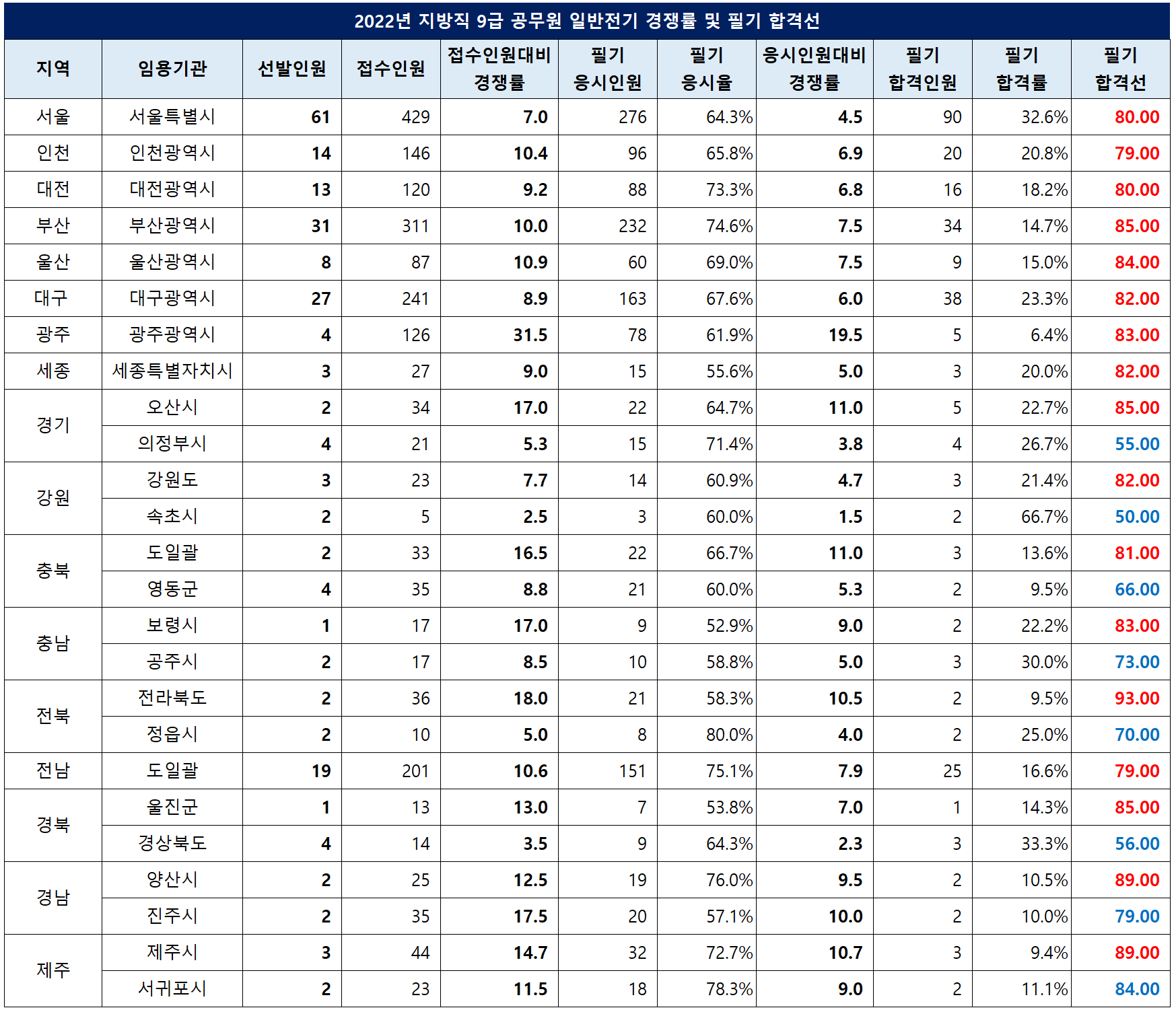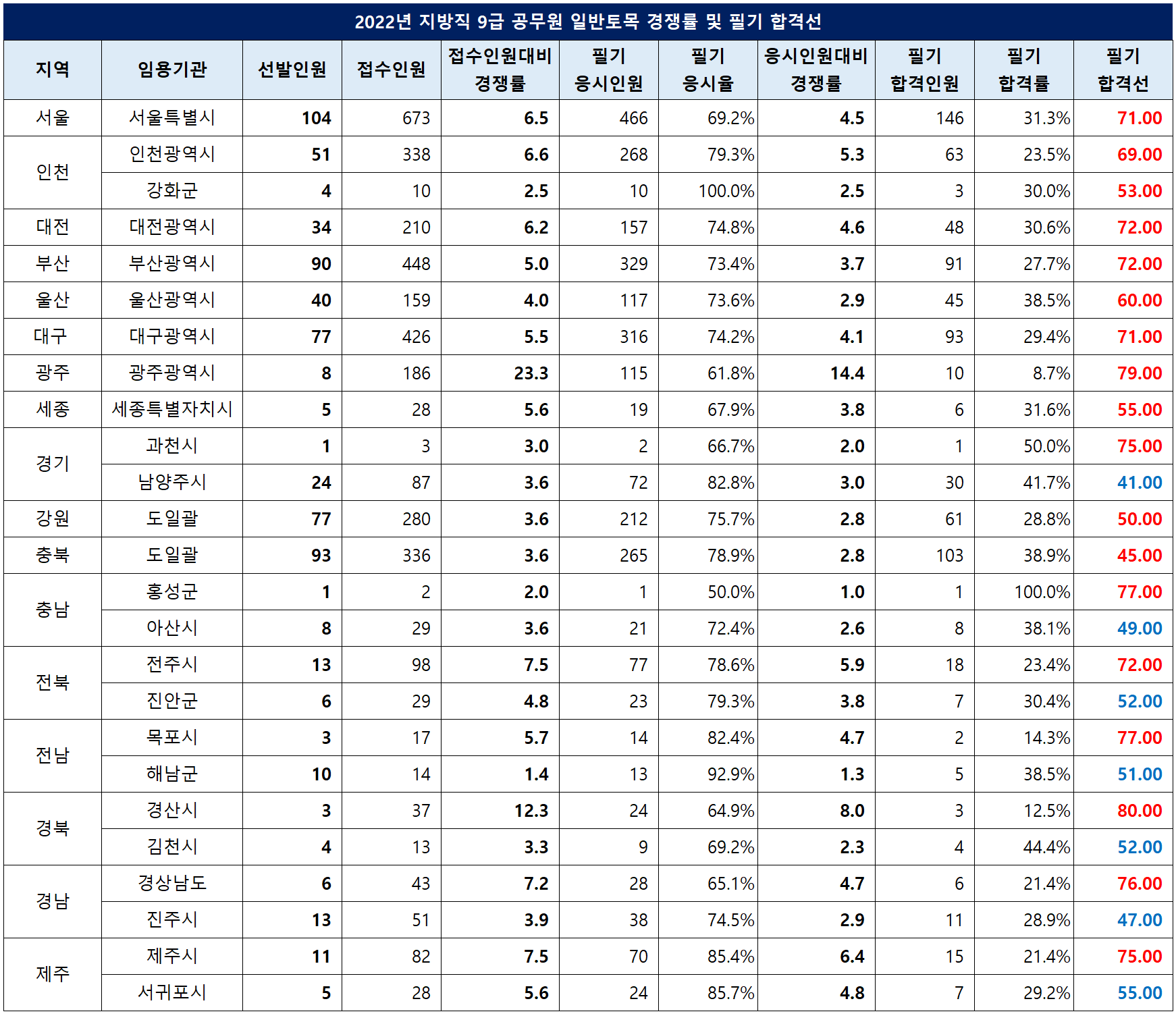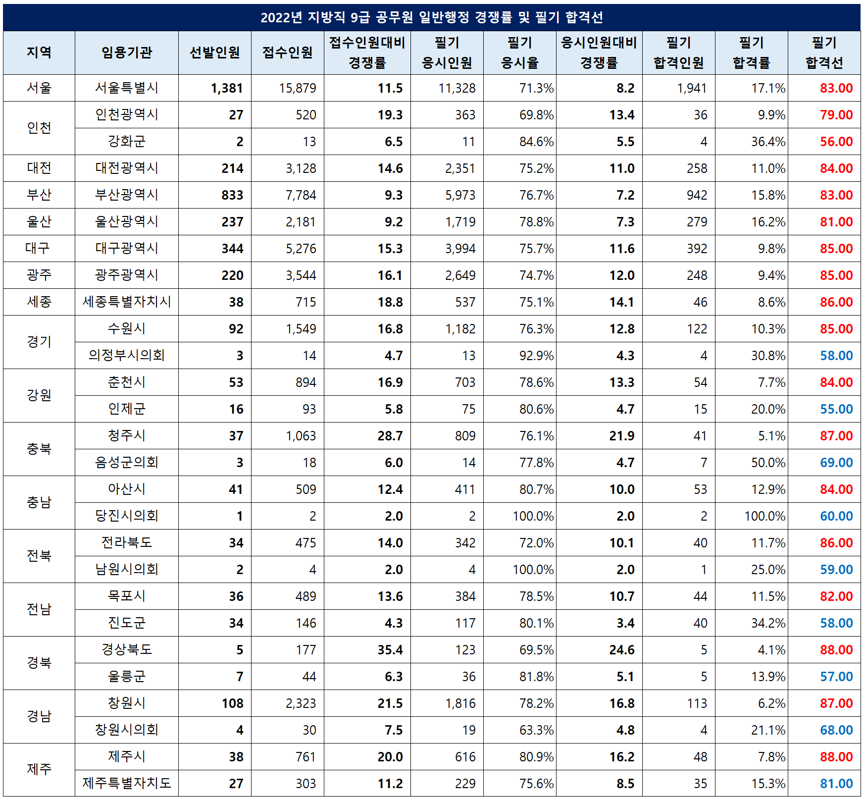 7월 중에 모든 지역의 필기시험 합격자와 합격선이 발표되었는데요. 이번 포스팅에서는 먼저 17개 시도 지방직 공무원 주요 모집 직렬의 경쟁률과 합격선을 비교한 후, 각 지역별 모든 직렬의 지방직 필기컷을 정리했습니다.