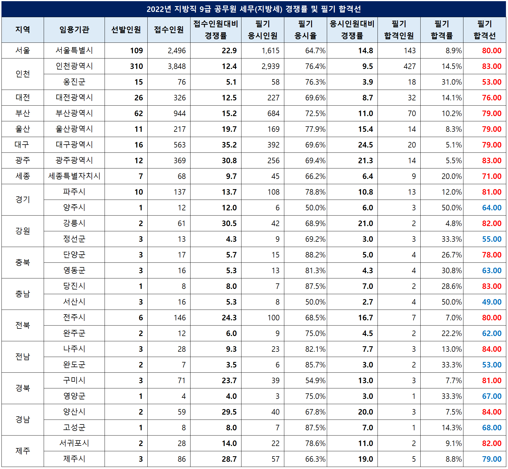 | 2022년 지방 세무직 공무원 합격선(커트라인) 및 경쟁률 비교 정리 (0) | 2022.09.05 |
