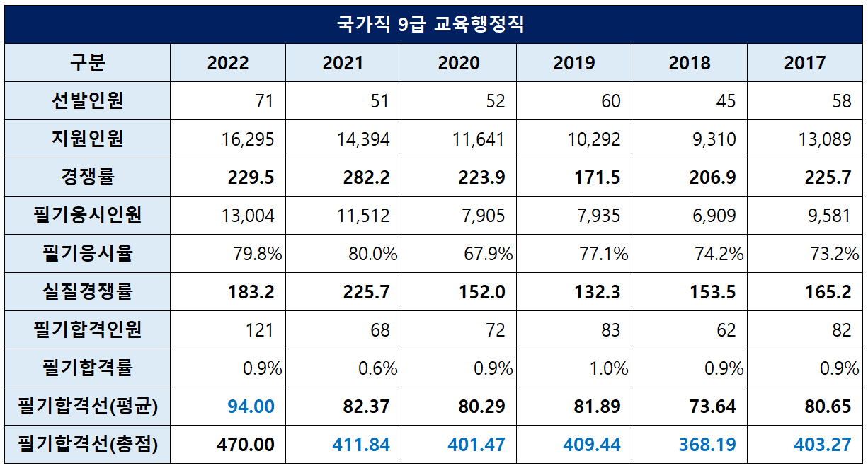 2022년 17개 시도 교육청에서 모집한 9급 교육행정직 선발인원, 경쟁률, 합격선 등을 아래 표로 정리했습니다.