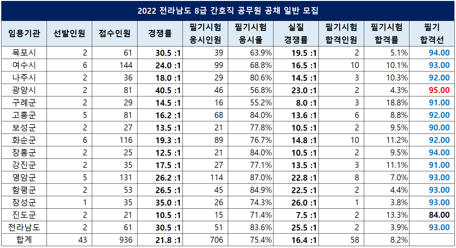 전라남도 간호직 공무원 경쟁률 및 합격선