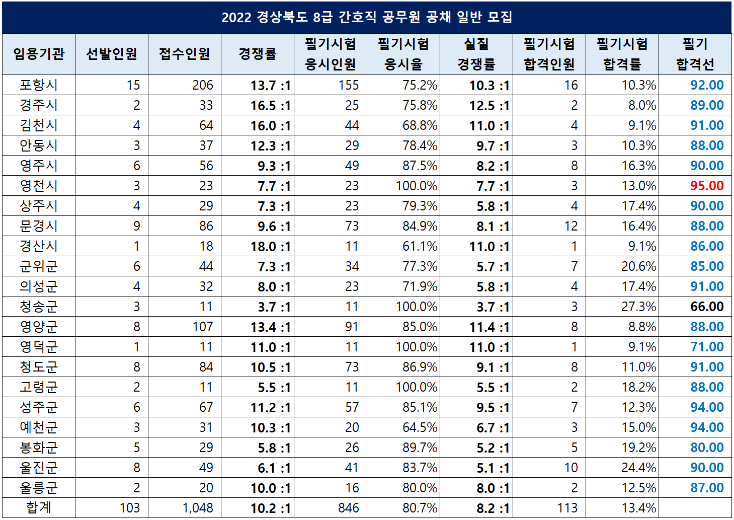 | 경북 | 103 | 1,048 | 10.2 :1 | 95.00 |