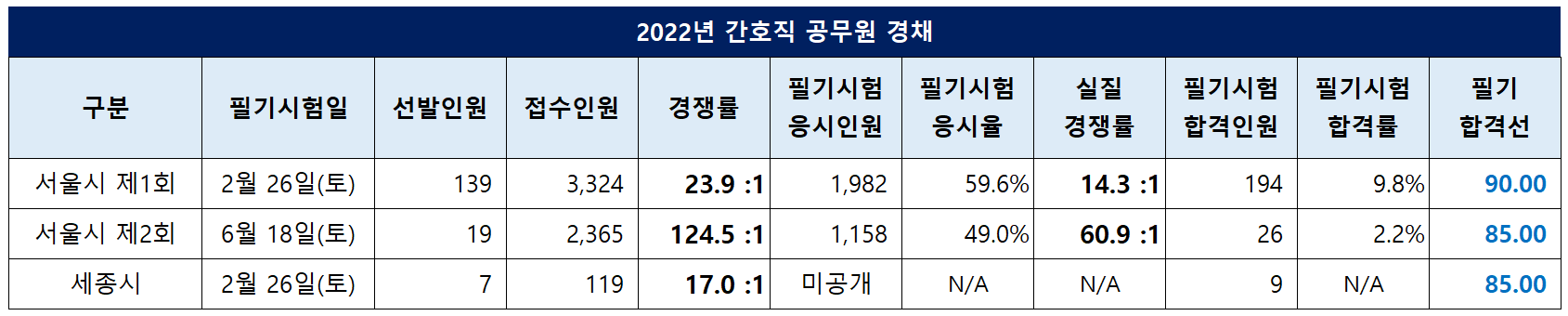 제2회 서울시 간호직 경채 시험은 19명밖에 선발하지 않았는데 2,365명이 원서 접수를 해 124.5대 1의 높은 경쟁률을 보였습니다. 실질 경쟁률은 60.9대 1이었고, 필기 합격선은 85.00점이었습니다.