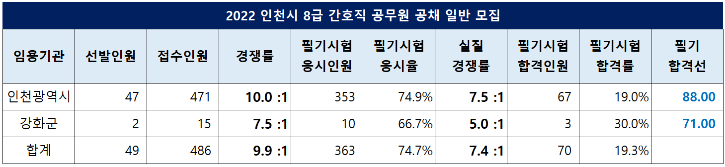 인천광역시가 임용하는 8급 간호직 공무원은 47명을 선발하는데 471명이 원서접수를 해 10.0대 1의 경쟁률을 기록했고, 필기 합격선은 88.00점이었습니다.