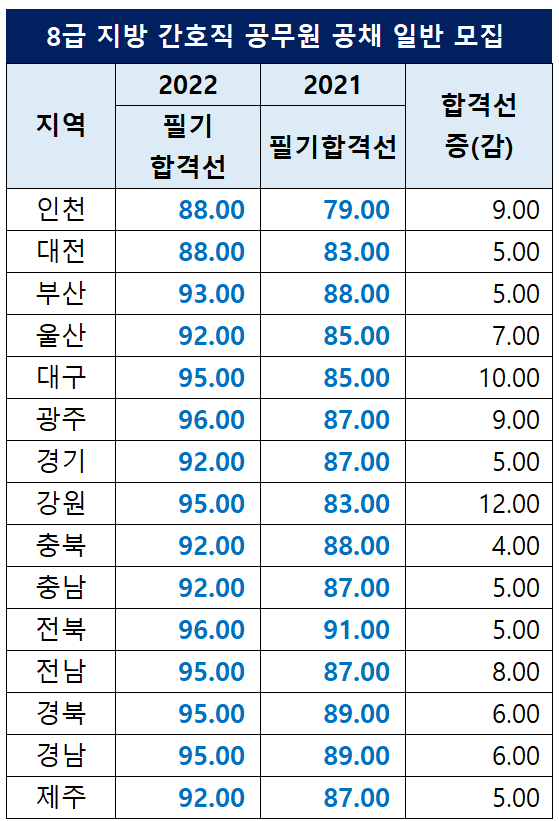2022년 간호직 공무원 필기 합격선은 아래 표에서 보는 것처럼 2021년 대비 상승했습니다. 지난해 가장 높은 간호직 공무원 필기 합격선은 91.00점(전북 전주시)이었는데요. 2022년에는 광주시와 전북(무주군)의 합격선이 96.00점으로 가장 높았습니다.