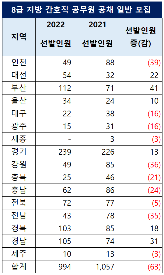 2022년 전국에서 지방직 공무원 공채로 선발한 8급 간호직은 총 994명인데요. 지난해 선발인원 1,057명보다 63명이 감소했습니다.