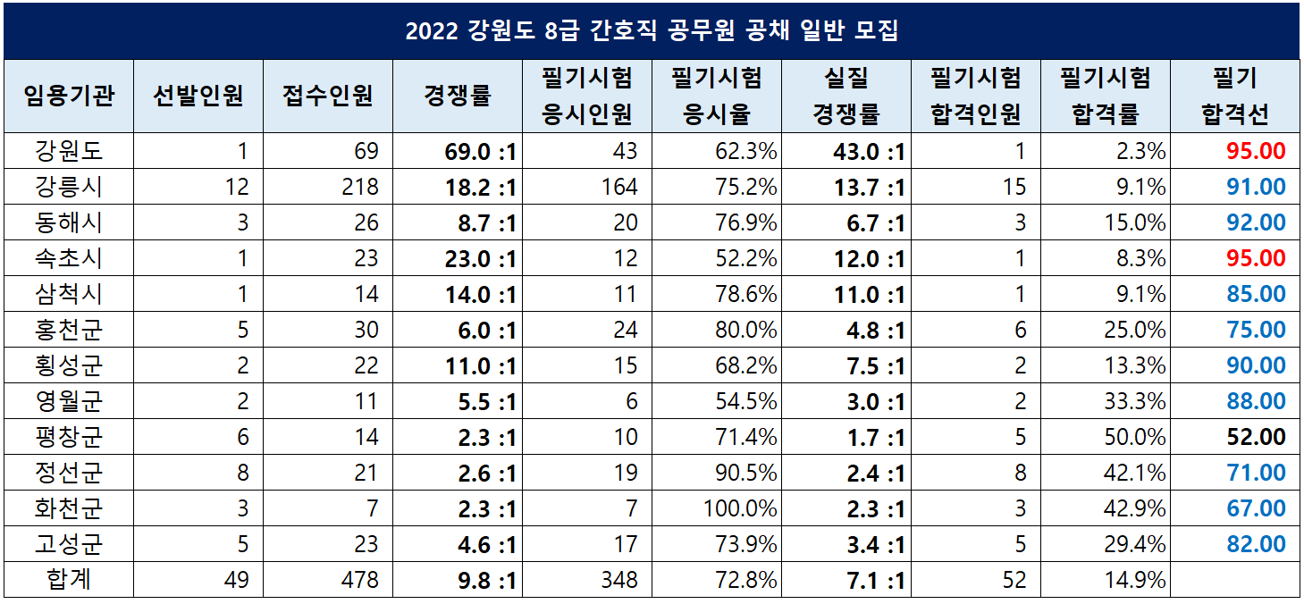 | 강원 | 49 | 478 | 9.8 :1 | 95.00 |
