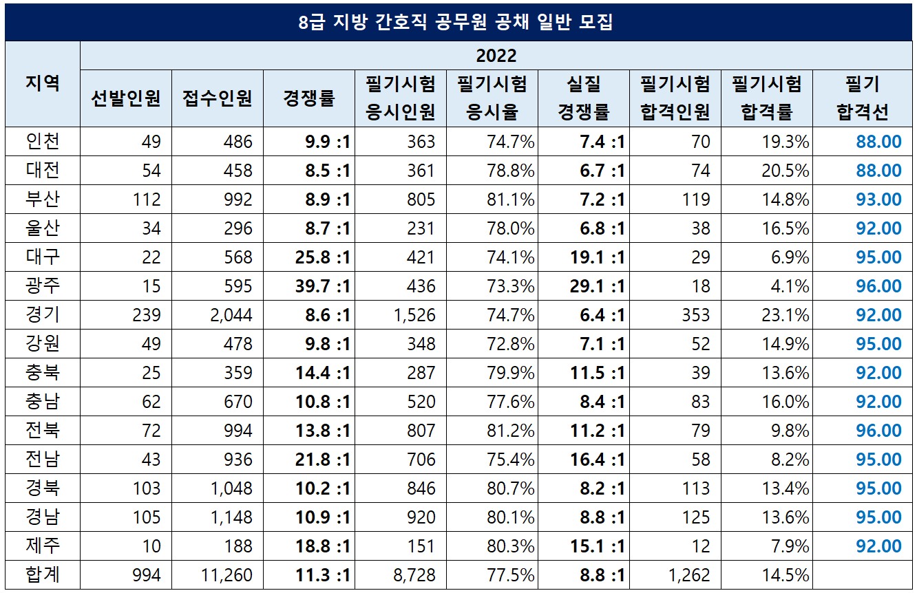 이번 포스팅에서는 2022년에 시행된 지방공무원 8급 간호직 경채 및 공채 시험의 선발인원, 경쟁률, 합격선 등에 대해 정리했습니다.