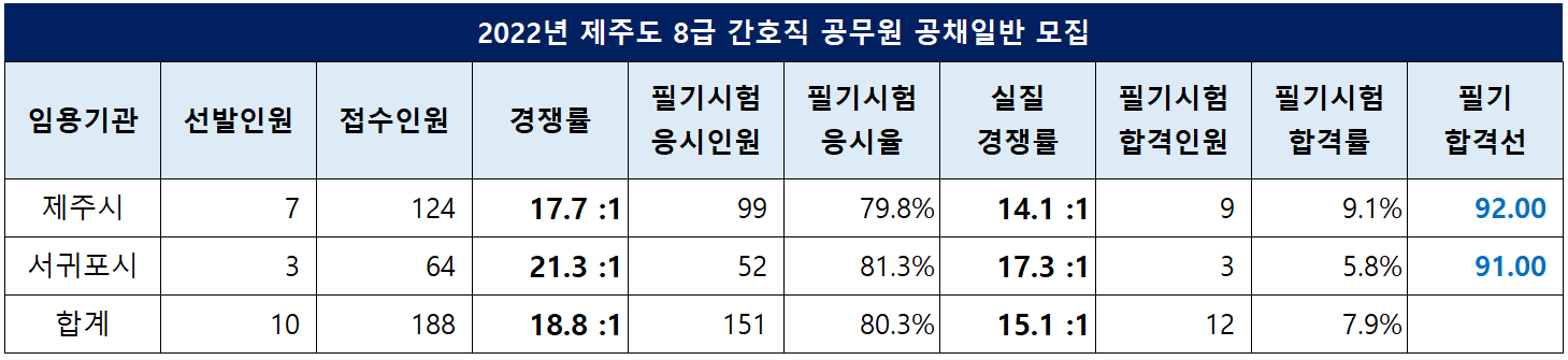 제주시가 임용하는 간호직 공무원의 경쟁률은 17.7대 1, 필기 합격선은 92.00점이었습니다.