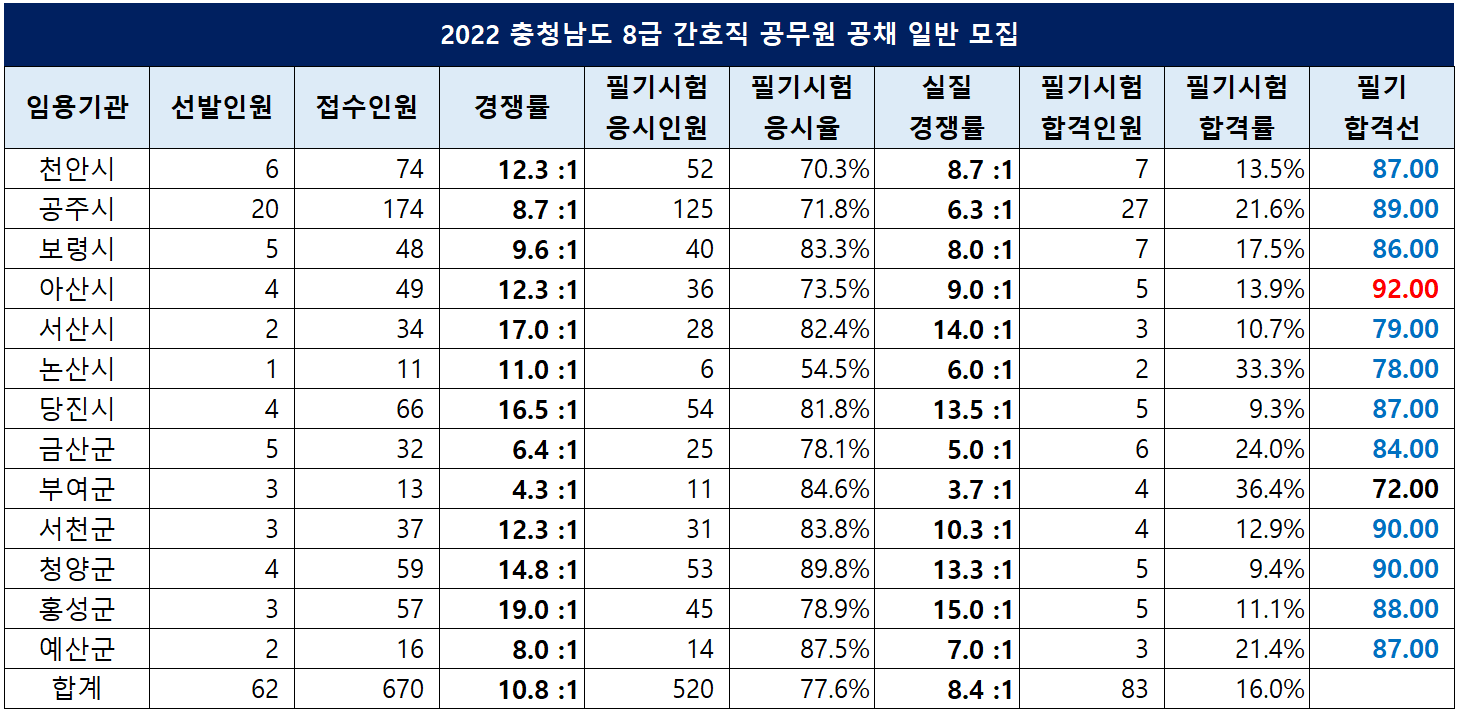 충청남도 간호직 공무원 합격선은 아산시가 92.00점으로 가장 높았고, 부여군이 72.00점으로 가장 낮았습니다.