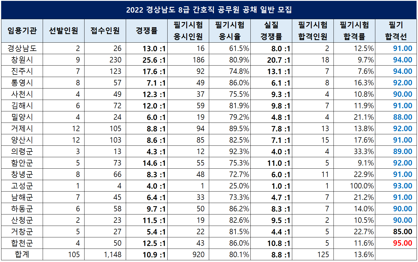 경상남도 간호직 공무원 합격선은 합천군이 95.00점으로 가장 높았고, 거창군이 85.00점으로 가장 낮았습니다.