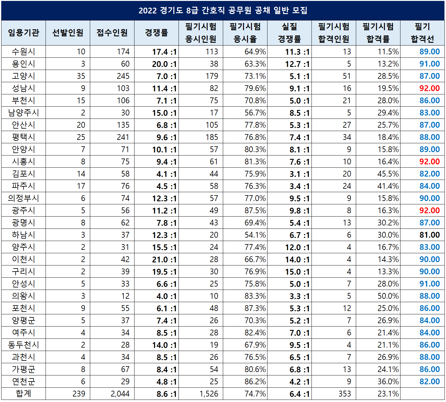 | 경기 | 239 | 2,044 | 8.6 :1 | 92.00 |