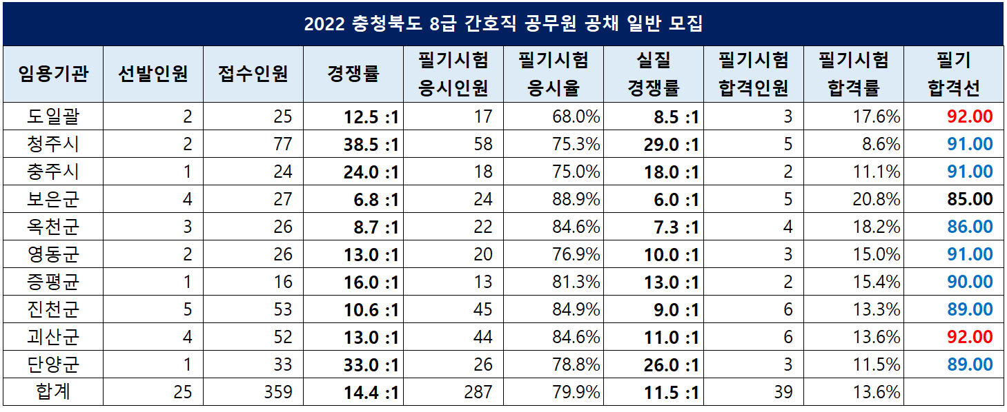 | 충북 | 25 | 359 | 14.4 :1 | 92.00 |