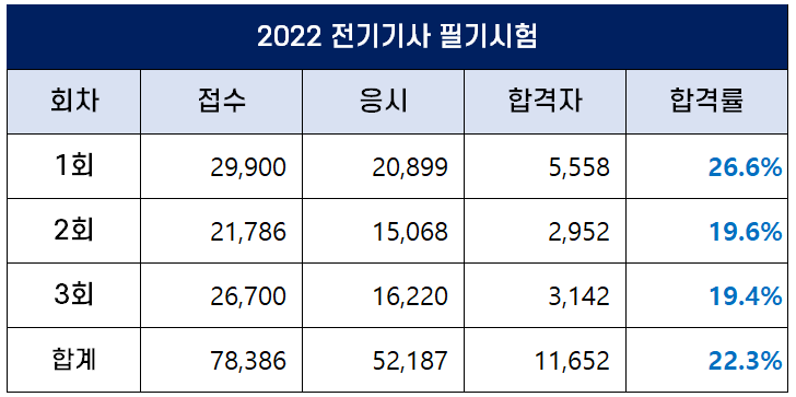 아래 표에서 보는 것처럼 2022년 전기기사 필기시험에는 총 78,386명이 원서접수를 했는데요. 이 중 52,187명이 필기시험에 응시했고 11,652명이 합격을 해 평균 합격률은 22.3%입니다.
