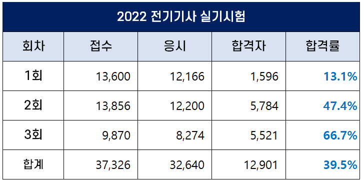 2022년 3회 전기기사 실기 합격률은 66.7%로 가장 높았고, 2022년 평균 합격률은 39.5%입니다.
