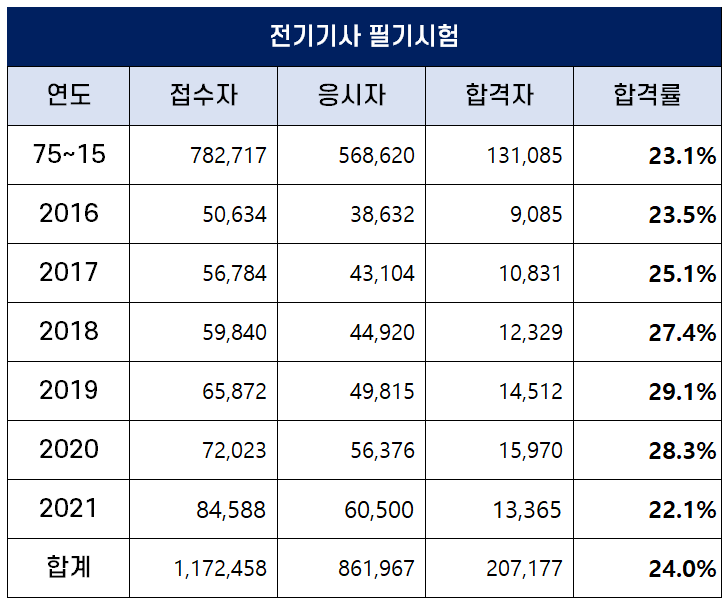 아래 표는 2021년까지 역대 전기기사 필기 합격률인데요. 2019년 필기 합격률이 29.1%로 가장 높았고, 2021년 합격률이 22.1%로 가장 낮았습니다.
