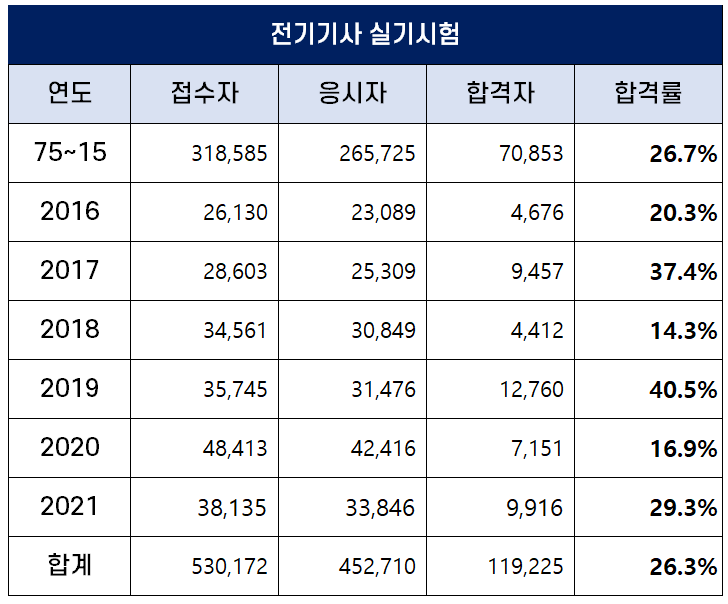 아래 표는 2021년까지 역대 전기기사 실기 합격률인데요. 2019년 실기 합격률이 40.5%로 가장 높았고, 2018년 실기 합격률이 14.3%로 가장 낮았습니다.