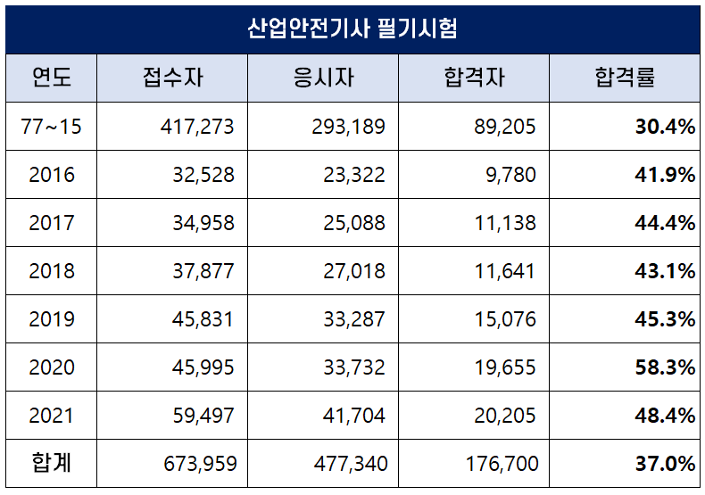 아래 표는 산업안전기사가 처음 시행된 1977년부터 2021년까지 역대 산업안전기사 필기 합격률인데요.