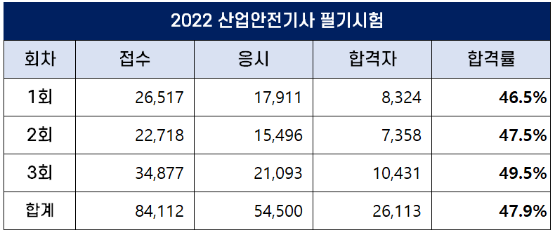 2022년 산업안전기사 필기시험 응시자 54,500명 중 26,113명이 합격해 평균 합격률은 47.9%입니다. 1회 산업안전기사 합격률은 46.5%, 2회 합격률은 47.5%, 3회 합격귤은 49.5%로 다른 시험보다는 회차별 합격률 편차가 크지 않은 편입니다.