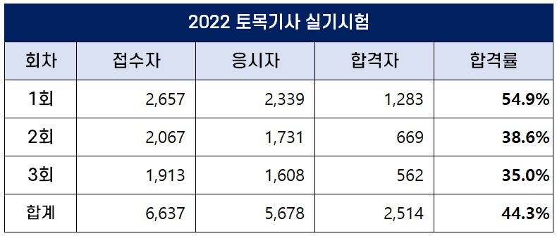 2022년 3회 토목기사 실기 합격률은 35.0%이고, 2022년 평균 합격률은 44.3%입니다.