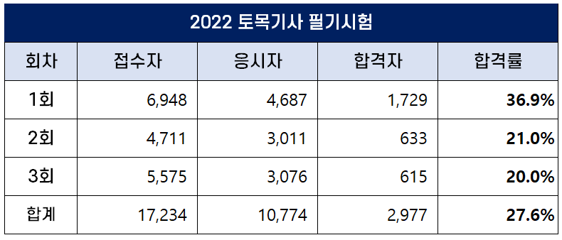 이번 포스팅에서는 2022년에 시행된 1회, 2회, 3회 토목기사 필기 및 실기 시험 원서접수인원, 응시인원, 합격인원 및 합격률에 대해 정리했습니다.