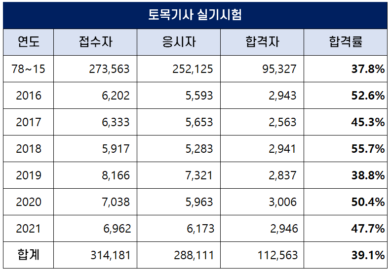 아래 표는 토목기사가 시행되기 시작한 1978년부터 2021년까지 역대 토목기사 필기 합격률인데요. 평균 합격률은 29.6%이며 2020년에 35.8%로 높은 합격률을 보였습니다.