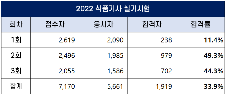 2022년 3회 식품기사 실기 합격률은 44.3%이고, 2022년 평균 합격률은 33.9%입니다.