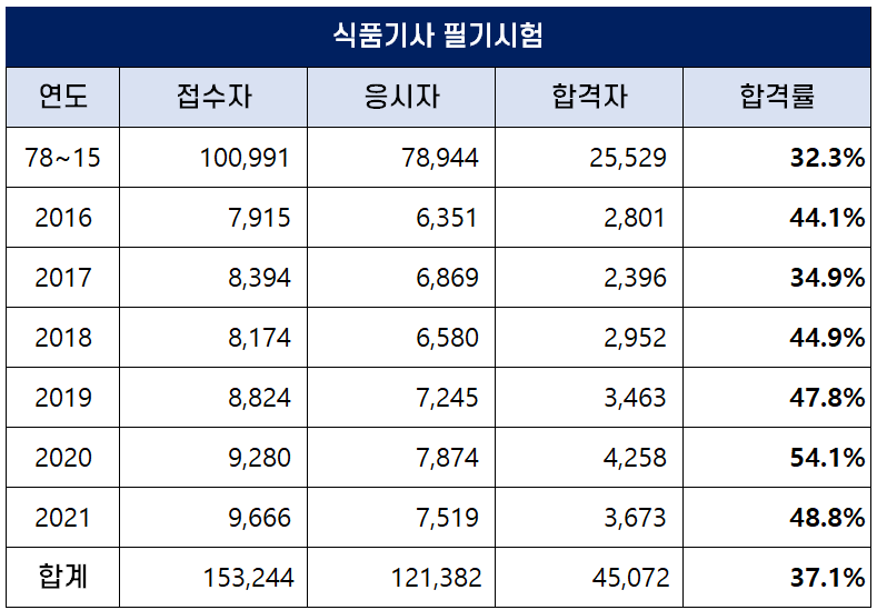 식품기사가 시행된 1978년부터 2021년까지 역대 식품기사 필기 평균 합격률은 37.1%인데요. 2020년에는 역대 가장 높은 54.1%의 합격률을 기록했습니다.
