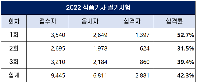 아래 표에서 보는 것처럼 2022년 식품기사 필기시험에는 총 9,445명이 원서접수를 했는데요. 이 중 6,811명이 필기시험에 응시했고 2,881명이 합격을 해 평균 합격률은 42.3%입니다.