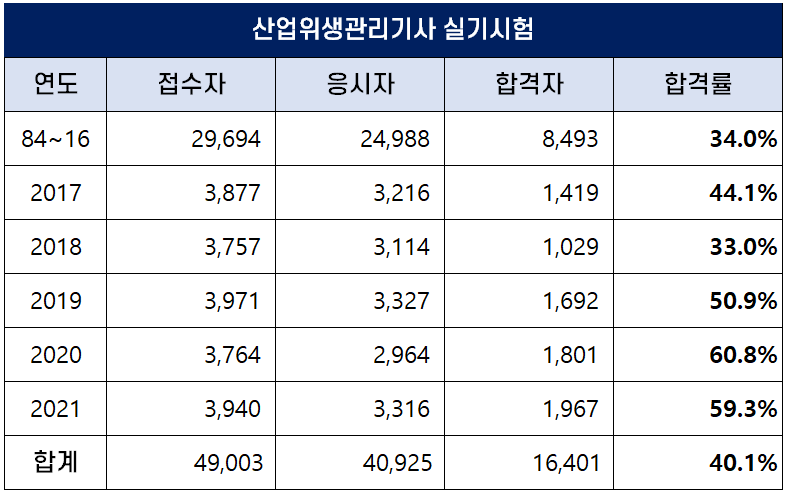 역대 산업위생관리기사 실기 평균 합격률은 40.1%인데요. 최근 합격률이 높아져 2020년에는 60.8%, 2021년에는 59.3%의 높은 합격률을 보였습니다.