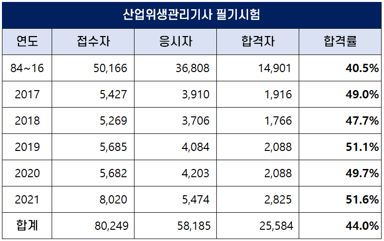 아래 표는 산업위생관리기사가 처음 시행된 1984년부터 2021년까지의 역대 필기 합격률인데요. 평균 필기 합격률은 44.0%입니다.