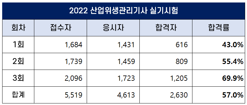 2022년 3회 산업위생관리기사 실기 합격률은 69.9%이고, 2022년 평균 합격률은 57.0%입니다.