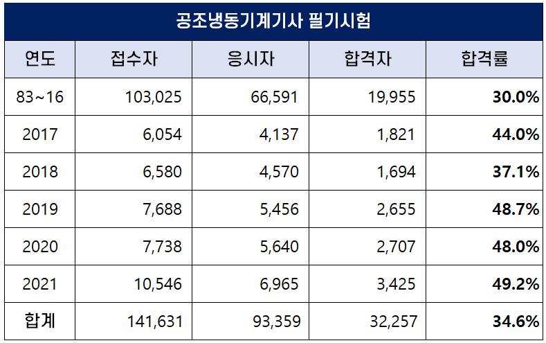 아래 표는 공조냉동기계기사가 처음 시행되기 시작한 1983년부터 2021년까지 역대 합격률인데요. 평균 필기 합격률은 34.6%이나, 최근 합격률이 높아져 2021년에는 49.2%의 높은 합격률을 기록하기도 했습니다.