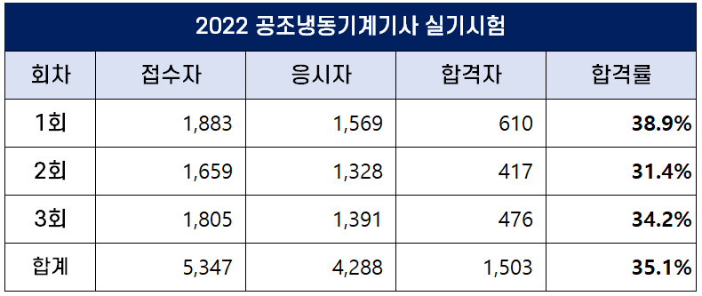 2023년 공조냉동기계기사 합격률 (1회, 2회, 3회 필기 및 실기)