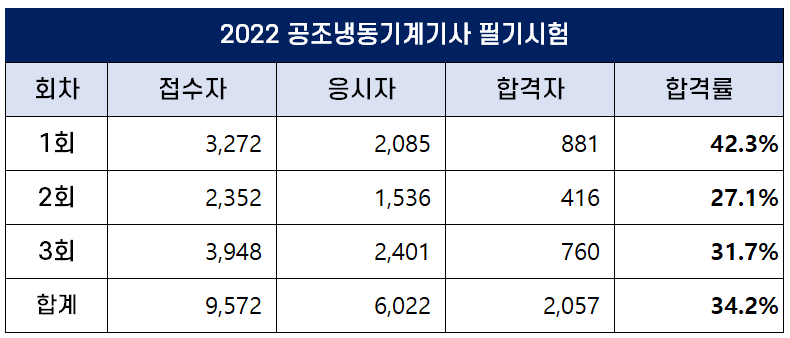 아래 표에서 보는 것처럼 2022년 공조냉동기계기사 필기시험에는 총 9,572명이 원서접수를 했는데요. 이 중 6,022명이 필기시험에 응시했고 2,057명이 합격을 해 평균 합격률은 34.2%입니다.