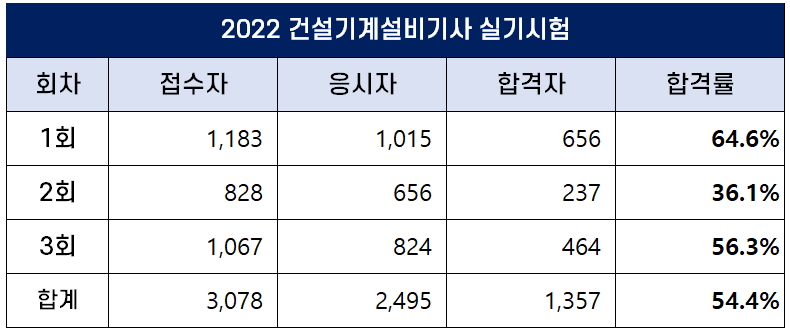 2022년 3회 건설기계설비기사 실기 합격률은 56.3%이고, 2022년 평균 합격률은 54.4%입니다.