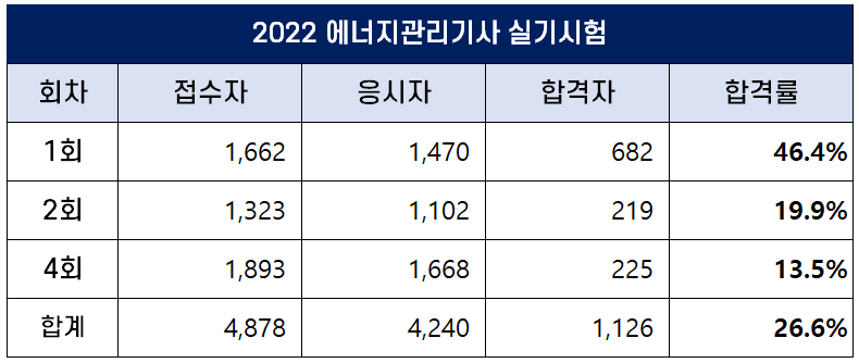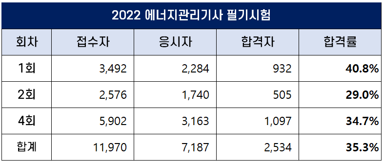 이번 포스팅에서는 2022년에 시행된 1회, 2회, 4회 에너지관리기사 필기 및 실기 시험 원서접수인원, 응시인원, 합격인원 및 합격률에 대해 정리했습니다.