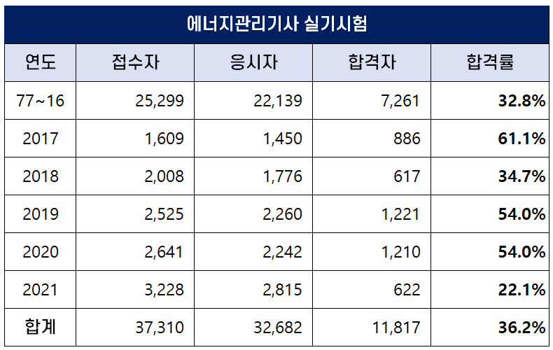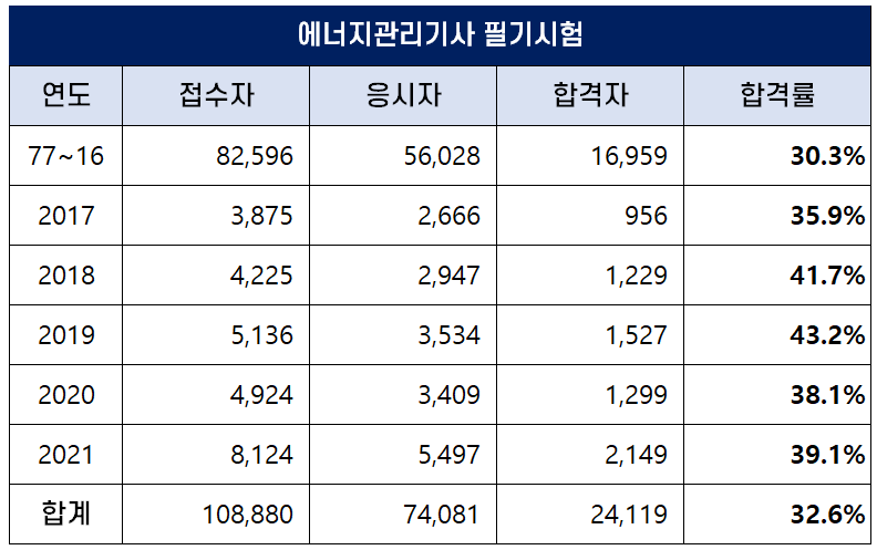 아래 표는 에너지관리기사가 시행된 1977년부터 2021년까지 역대 에너지관리기사 필기시험 합격률인데요. 평균 합격률은 32.6%이나 최근 합격률이 높아져 2019년에는 43.2%의 높은 합격률을 기록하기도 했습니다.