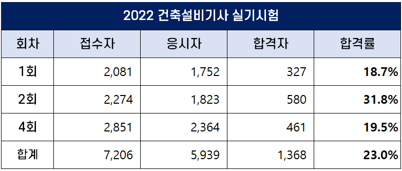 2022년 4회 건축설비기사 실기 시험 합격률은 19.5%이고, 2022년 평균 합격률은 23.0%입니다.