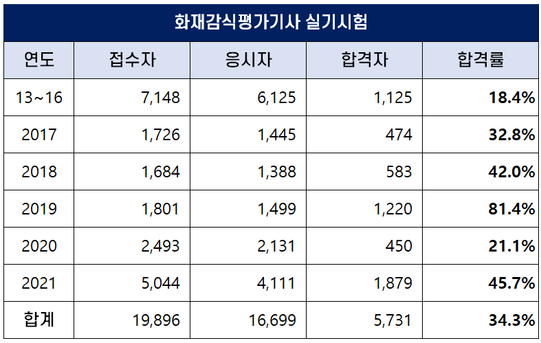 아래 표는 화재감식평가기사 자격시험이 처음 시행된 2013년부터 2021년까지 역대 화재감식평가기사 필기시험 합격률인데요. 평균 합격률은 81.5%로 다른 기사 자격증에 비해 필기 합격률이 매우 높은 편입니다.