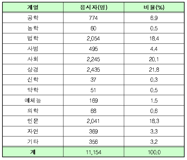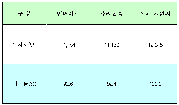 전체 지원자 12,048명 중 언어 이해 영역은 11,154명이 응시하였고, 추리논증 영역은 11,133명이 응시하였음.