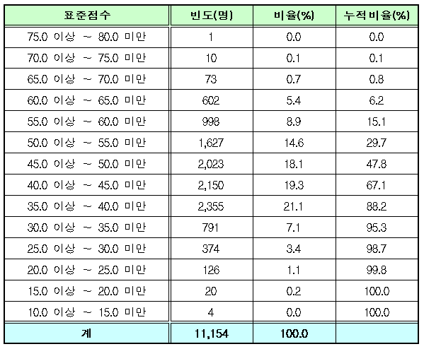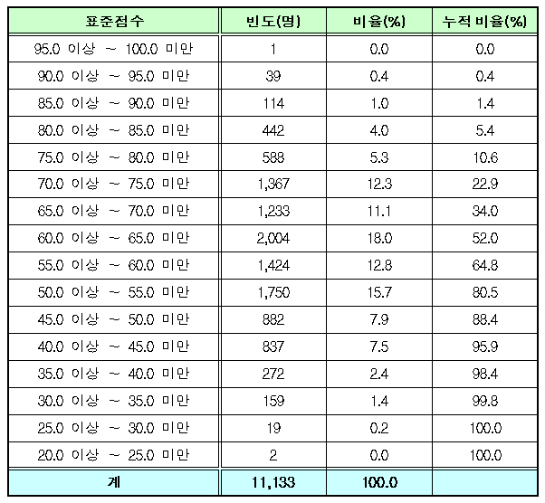2021 리트 추리 논증 영역의 표준 점수는 20.0 이상 ~ 100.0 미만의 구간에 분포하였으며, 가장 많은 응시자가 분포한 구간은 60.0 이상 ~ 65.0 미만으로, 이 구간에 속한 응시자는 2,004명(18.0%)이었음.