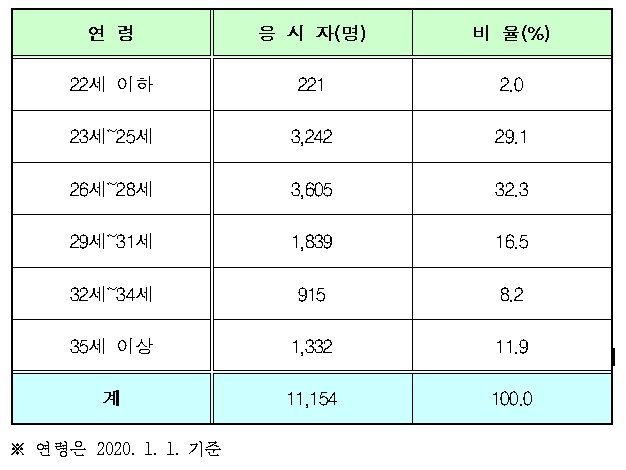 2021 리트 언어이해 영역 응시자 11,154명 중에서 26세 이상 28세 이하가 3,605명(32.3%)으로 가장 많았고, 23세 이상 25세 이하가 3,242명(29.1%), 29세 이상 31세 이하 1,839명(16.5%)이었음. 35세 이상 응시자도 1,322명으로 전체 응시자의 11.9% 임.
