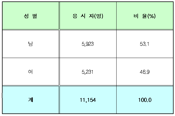 2021 리트 언어이해 영역 응시자 11,154명 중에 남자가 5,923명(53.1%), 여자가 5,231명(46.9%)으로 남자 응시자의 비율이 여자 응시자에 비해 높았음.