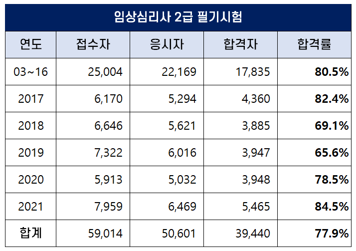 아래 표는 임상심리사 2급 자격시험이 시행된 시행된 2003년부터 2021년까지 역대 임상심리사 2급 필기시험 합격률인데요. 평균 합격률은 77.9%로 높은 편입니다.