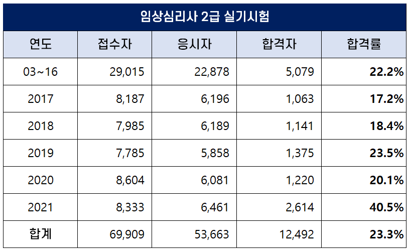 2003년부터 2021년까지 역대 임상심리사 2급 실기 평균 합격률은 23.3%로 실기 합격률이 필기 합격률보다 상당히 낮은 편입니다. 2021년에는 40.5%의 높은 합격률을 기록하기도 했습니다.