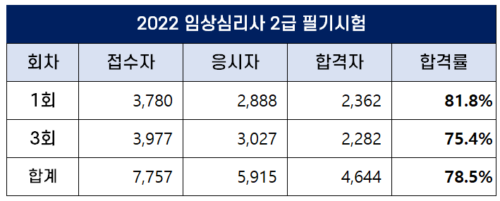 아래 표에서 보는 것처럼 2022년 임상심리사 2급 필기시험에는 총 7,757명이 원서접수를 했는데요. 이 중 5,915명이 필기시험에 응시했고 4,644명이 합격을 해 평균 합격률은 78.5%입니다.