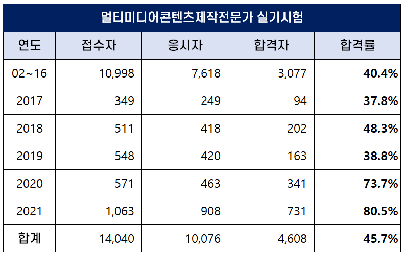 2002년부터 2021년까지 역대 멀티미디어콘텐츠제작전문가 실기 평균 합격률은 45.7%인데요. 최근 합격률이 높아져 2021년에는 80.5%의 높은 합격률을 기록하기도 했습니다.